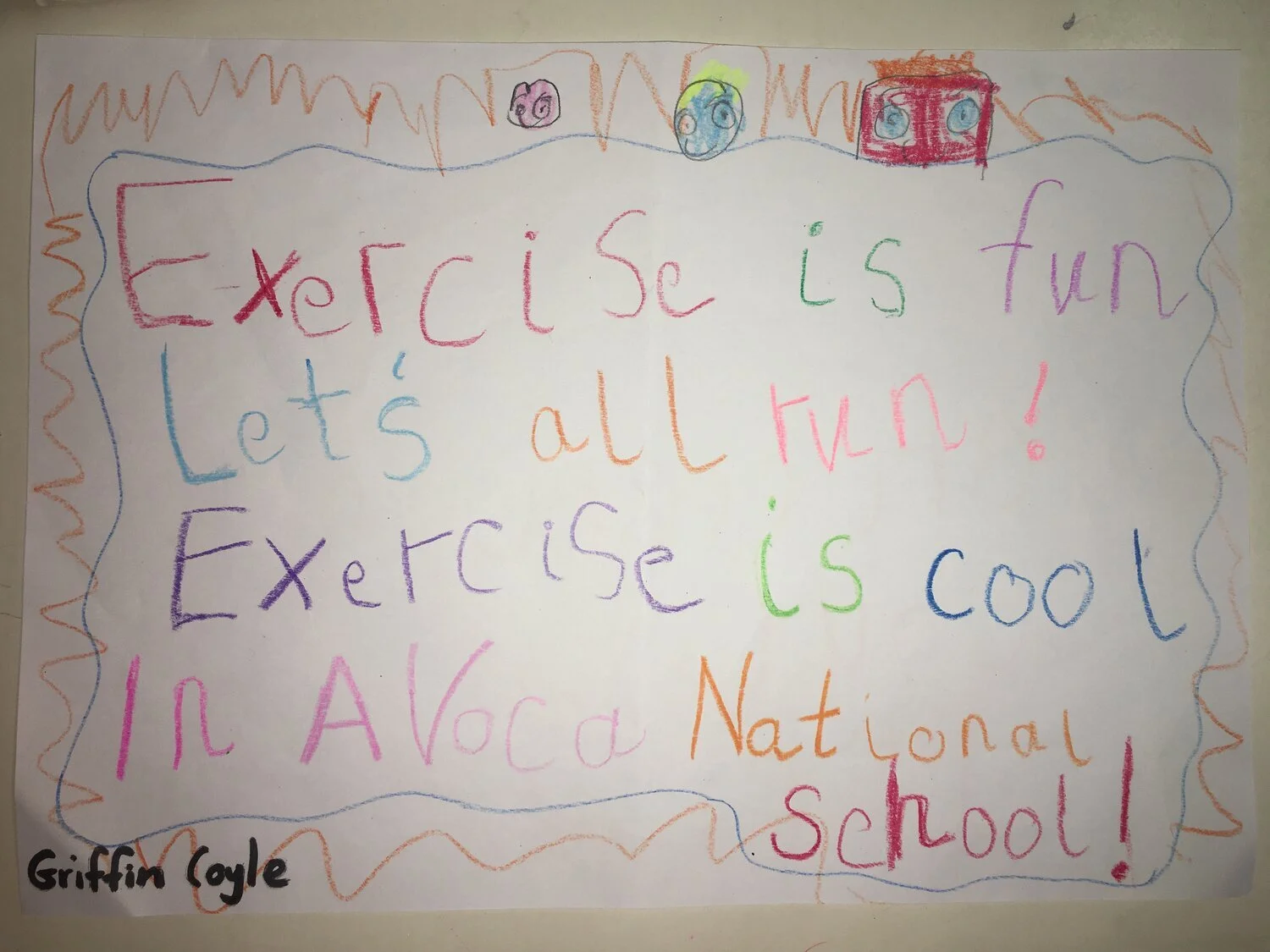 The Active School Committee at Avoca N.S. thought that we needed a slogan to remind us to exercise. They set up a competition to find the best slogan. There were lots of people writing rhymes and everybody was very enthusiastic about the competition. The judges had a really hard job to pick winners but Sarah Brennan and Leah Fox from 3rd class emerged as eventual winners. Griffin Coyle from 1st class was the runner up. The class winners were as follows: Abby Moore (1st class),Freya Bass( 2nd class), Cathal Lancaster (3rd class), Niamh McGeechan and Helen Winterbotham (4th class), Shane Whelan(5th class) and Lauren Hubbard(6th class). The prize winners received their prizes at Mondayβs Assembly. Well done to all the winners and those who took part. The winning entry and runner-up are displayed below.