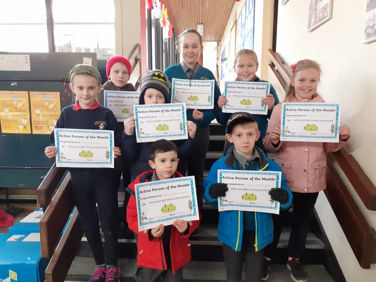Active βspiesβ from the Active Flag Committee go around at break times and become inspectors on both the Junior and the Senior yard, monitoring the yard and encouraging any standing or inactive children to βdo your talking as youβre walkingβ. They may inform a teacher of a very active child so that they can be considered for the next Active Person of the Month. At the end of each month, Ms. Byrne, our Active School coordinator presents a certificate at assembly to the children who have made a great effort to be active. One active person is chosen from each class. Januaryβs Active People were as follows: Atesh (Junior Infants) Jamie(Senior Infants) Andrew (1st class) Ciara (2nd class) Megan(3rd class) Taylor(4th class) Fiachra (5th class) and Lauren from 6th class. We will be looking out for more Active participants next month!