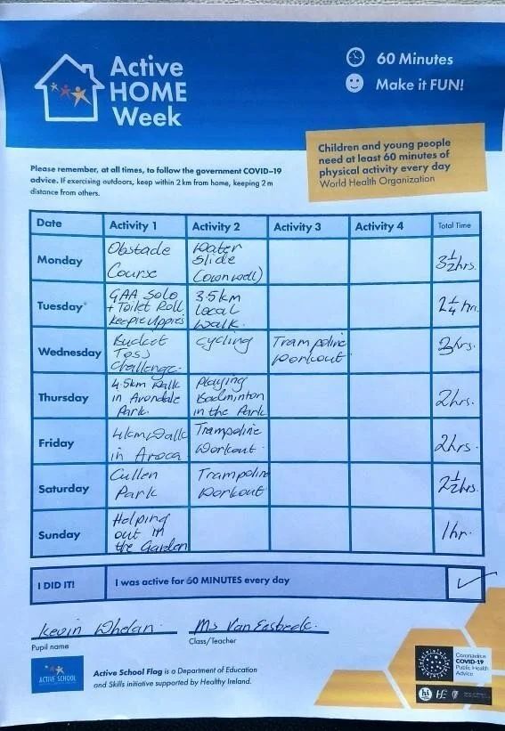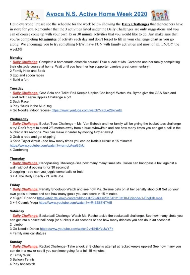 Active School Week is a very enjoyable part of the year for many children at Avoca N.S. and usually takes place at the end of every school year. Unfortunately due to school closures, we couldnβt have our annual Active School Week so we participated in βActive Home Weekβ instead. The week was very successful and much enjoyed by students, parents and staff at Avoca N.S. The Active Home Week ran from Monday 15th June and came to an end on Sunday 21st June. We asked the children to participate in 60 minutes of activity each day and to record their activities on their Active Home Week chart. The children were encouraged to try something NEW, have FUN with family activities and to ENJOY the week!